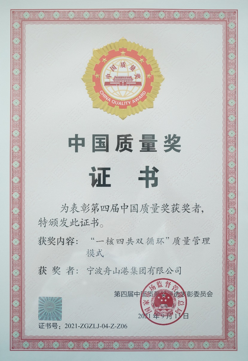 寧波舟山港第四屆中國質(zhì)量獎(jiǎng)獲獎(jiǎng)證書