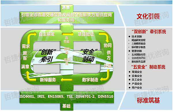 評審輔導(dǎo)期間,中車株機(jī)董事長對公司質(zhì)量管理模式高度重視,親自與我司首席咨詢專家熊偉教授和項(xiàng)目組成員對模式內(nèi)容進(jìn)行多次溝通和打磨,最終形成以“標(biāo)準(zhǔn)筑基—?jiǎng)?chuàng)新牽引—安全制動(dòng)—文化引領(lǐng)”為主線的“雙創(chuàng)新·五安全”交通裝備質(zhì)量管理模式”。