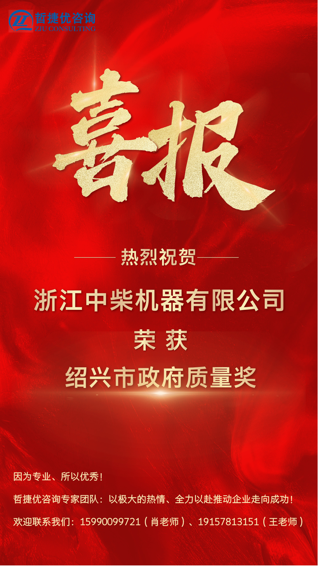 【質(zhì)量獎(jiǎng)創(chuàng)獎(jiǎng)】哲捷優(yōu)咨詢助力浙江中柴機(jī)器有限公司榮獲紹興市政府質(zhì)量獎(jiǎng)(紹興市質(zhì)量管理卓越企業(yè))