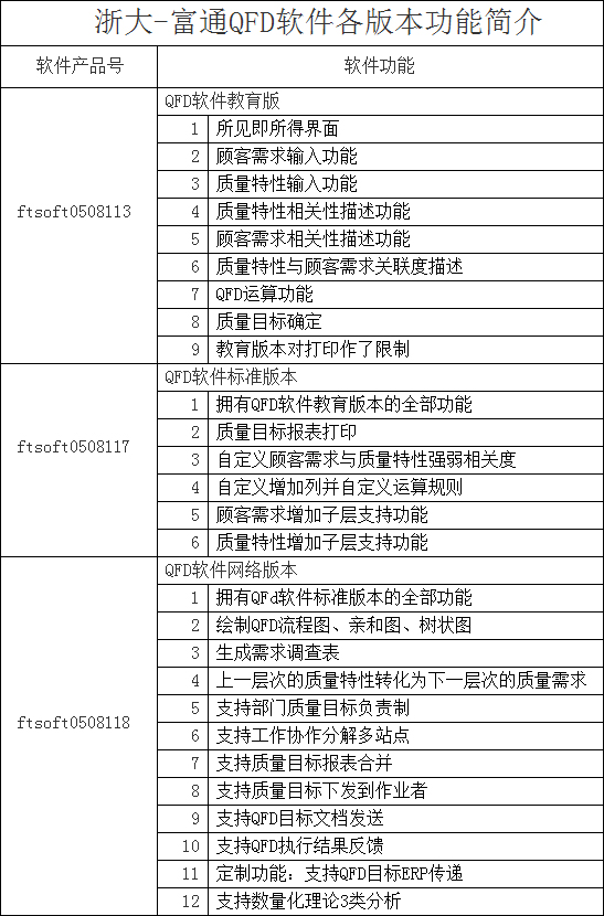 三、浙大-富通QFD軟件各版本功能簡介